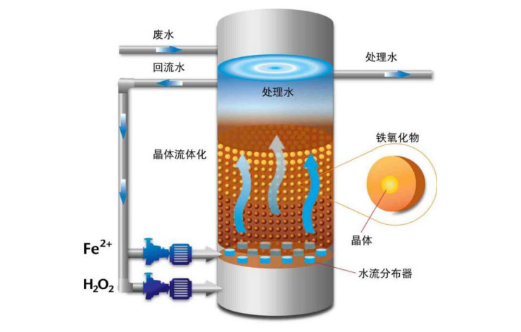 流化床芬顿是利用流化床的方式使芬顿技术所产生的羟基氧化铁 (FeOOH) •以结晶或披覆在流化床载体表面,是一种结合了均相化学氧化、异相化学氧化及流化床结晶功能的新技术。流化床芬顿氧化反应器采用亚铁离子 (Fe2+) 为催化剂,催化过氧化氢产生强氧化性的羟基自由基 (•OH) 氧化有机物并生成三价铁离子(Fe3+),而三价铁离子在催化剂作用下还原为亚铁离子。因此,可利用在反应器内循环反应的亚铁离子降低催化剂的消耗量,减少后续三价铁絮凝产生的污泥量从而大幅降低运行费用。